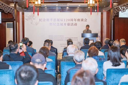 與會領導嘉賓參觀謝孝思誕辰120周年紀念展。主展廳用“黔山育才·江南結緣”“萬象更新·古城肇興”“遠見卓識·危難救急”“一核雙軸·古韻今風”4個篇章,詳細講述了謝孝思奔走呼號,修復園林和保護古城的事跡。兩側廂房設“藝術人生·筆墨寫意”“清正長留·風雨同舟”兩個篇章,展示了謝孝思為保護蘇劇、昆劇、彩繪、刺繡等蘇州文化元素所作的努力,以及他作為民進蘇州市地方組織主要創始人和核心領導者,為組織發展和“書畫擁軍”等特色工作開展作出的卓越貢獻。